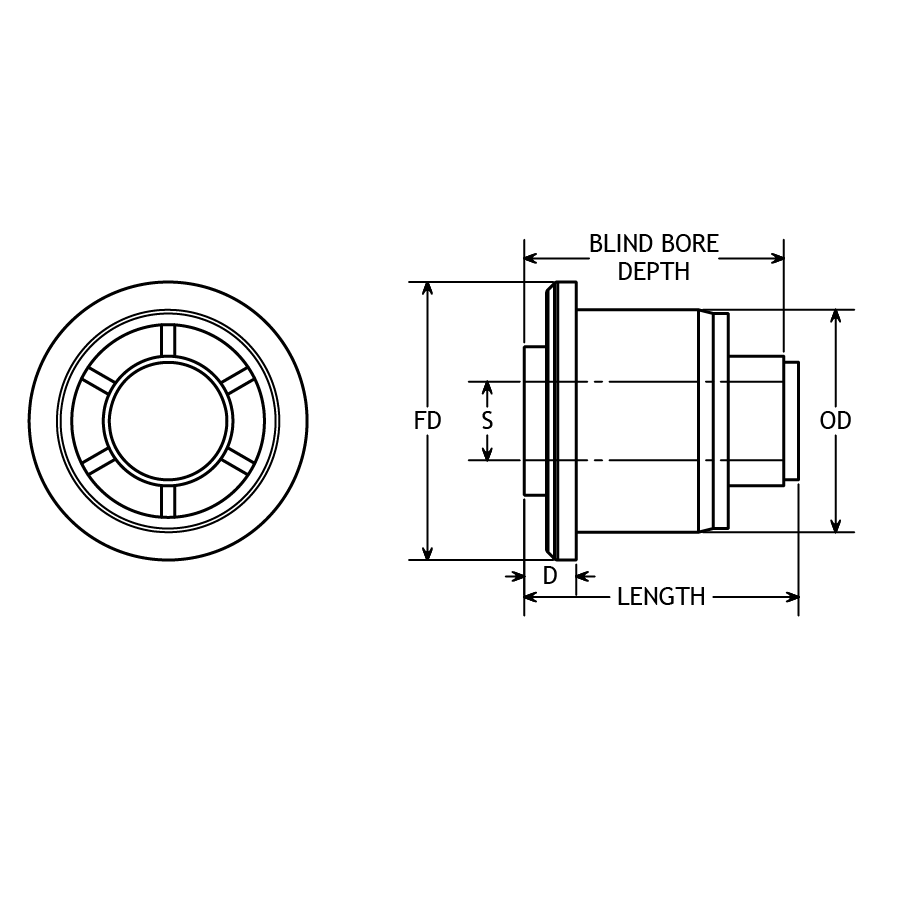 | BBMN24P4010 | 5/8" | 1-1/2" Sch. 40 | 1.610" | N | Molded Nylon Blind Bore Roll End Bearings | Nylon | 1.85” | ||